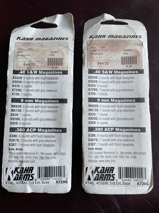 (2) Kahr Arms KT40, 7rd extended base factor magazines in .40 S&W NOS