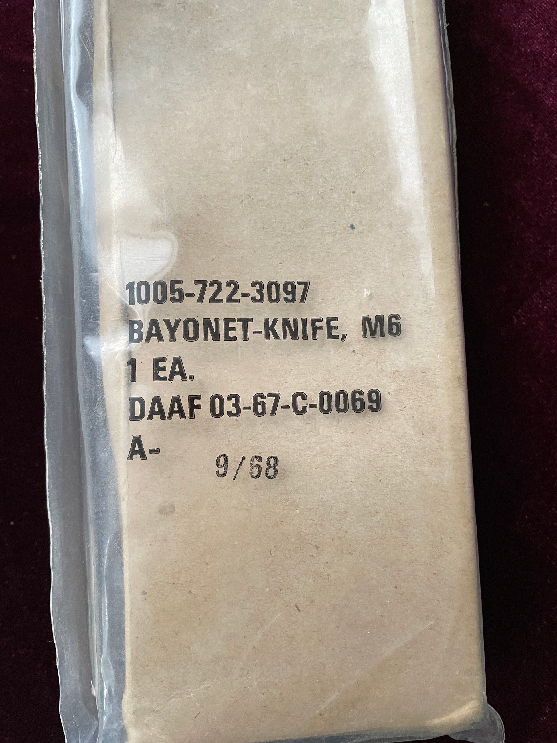An unopened, 1968 issue, M6 bayonet in original packing. Collector grade. Vietnam war era.