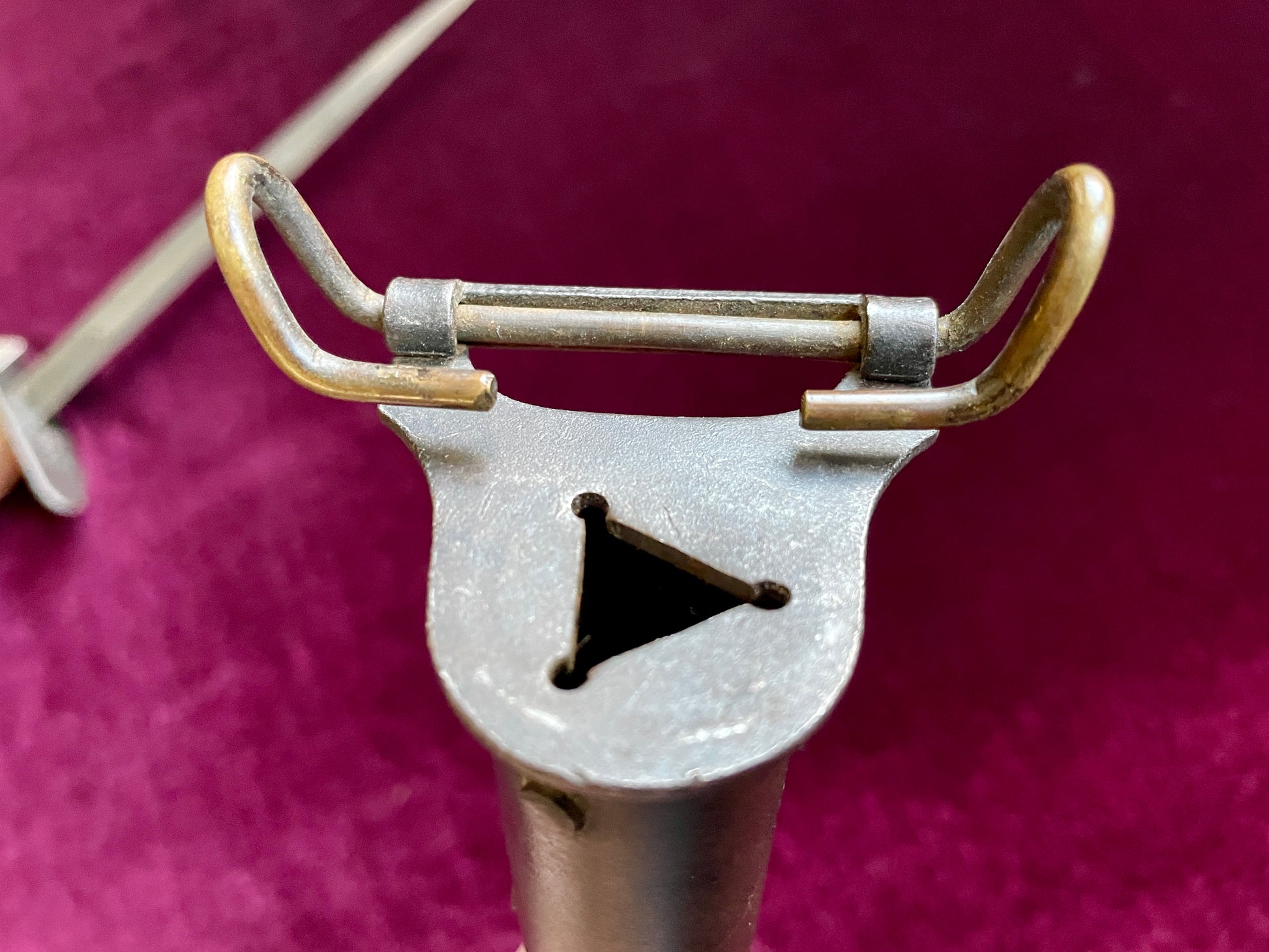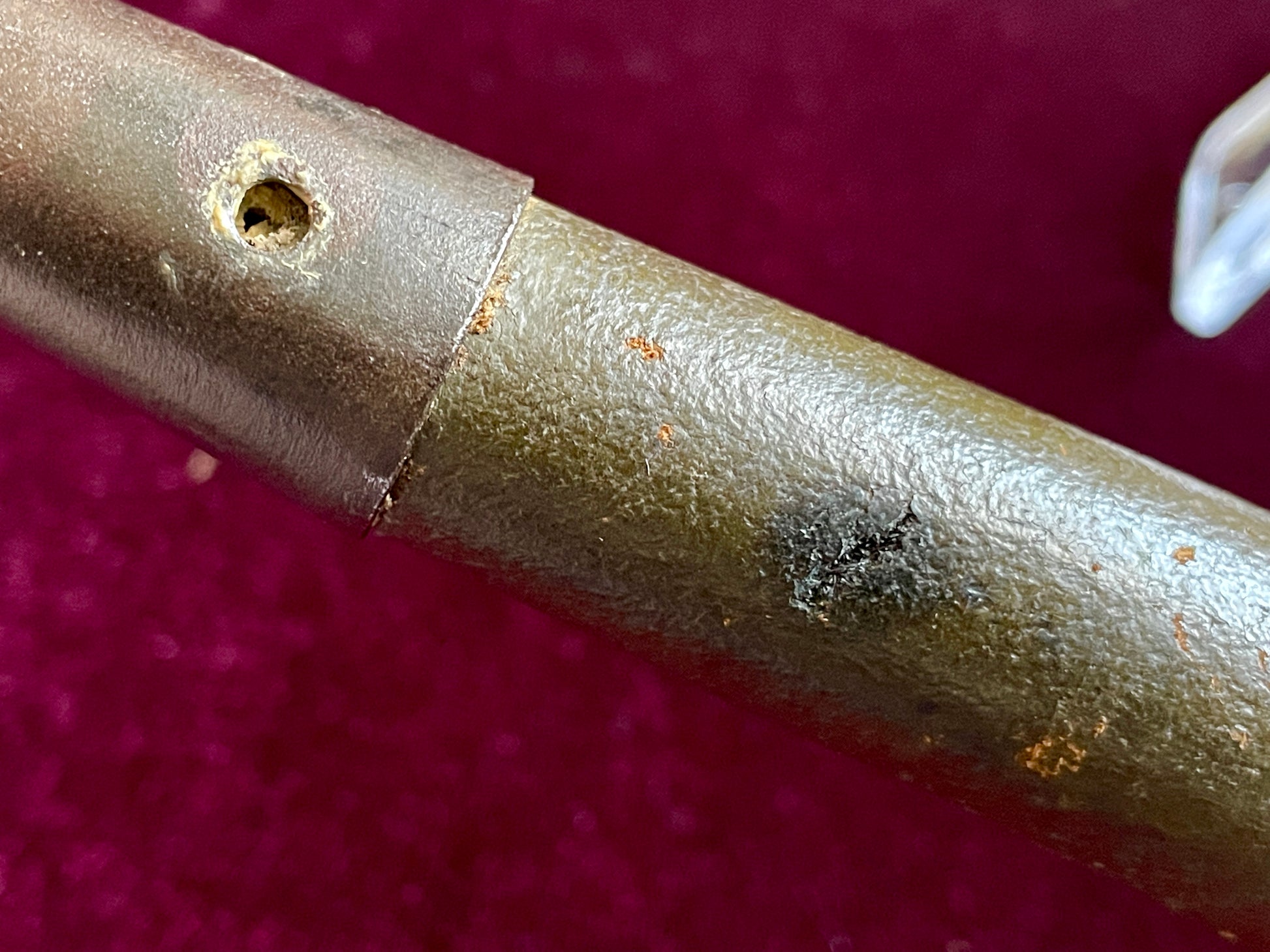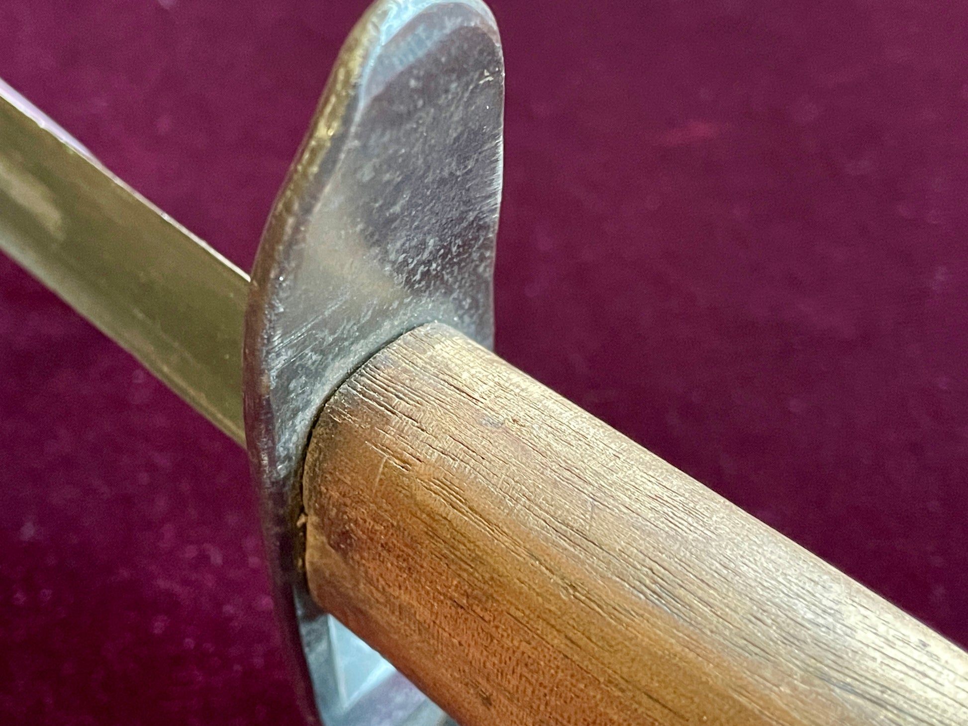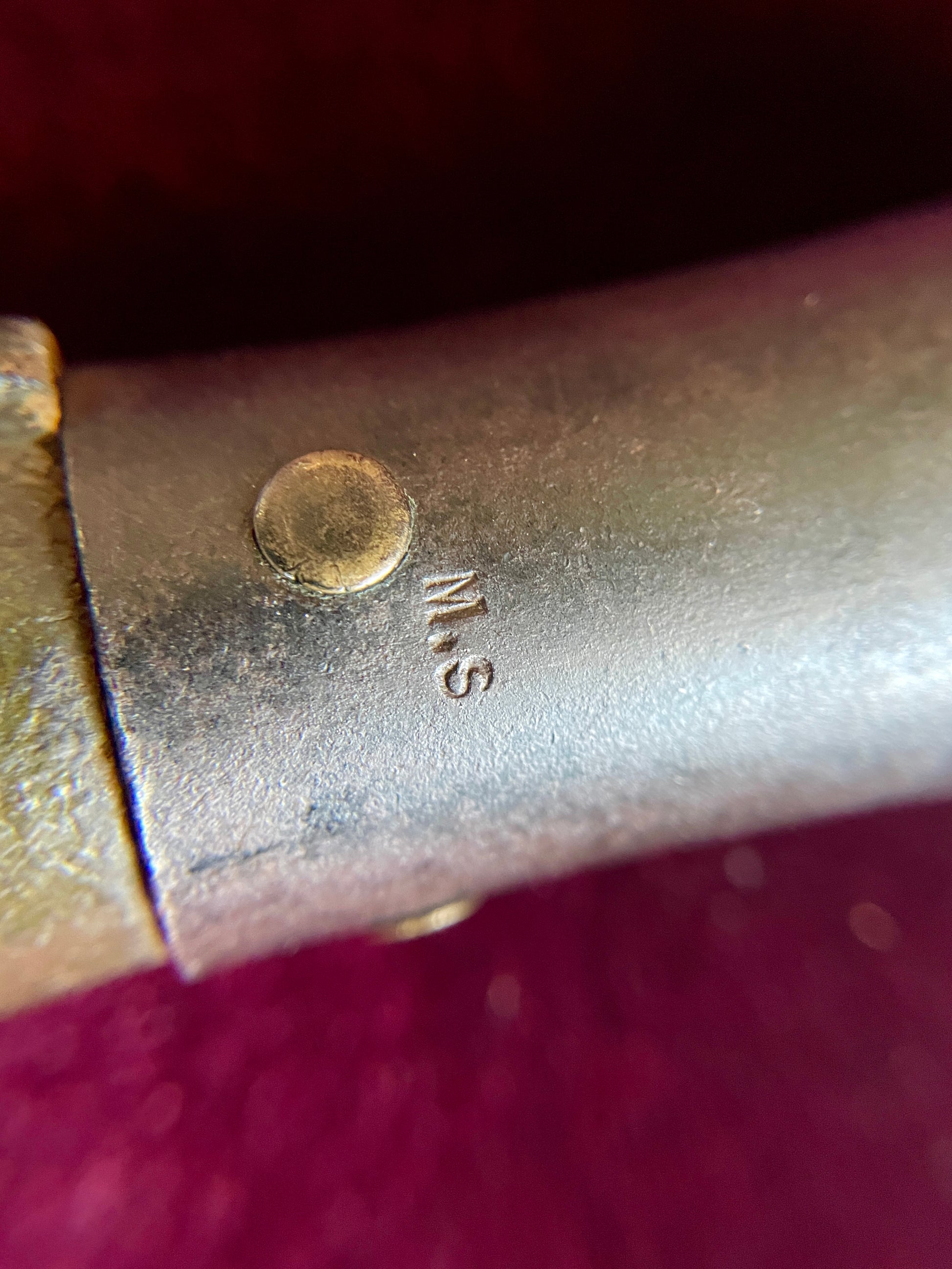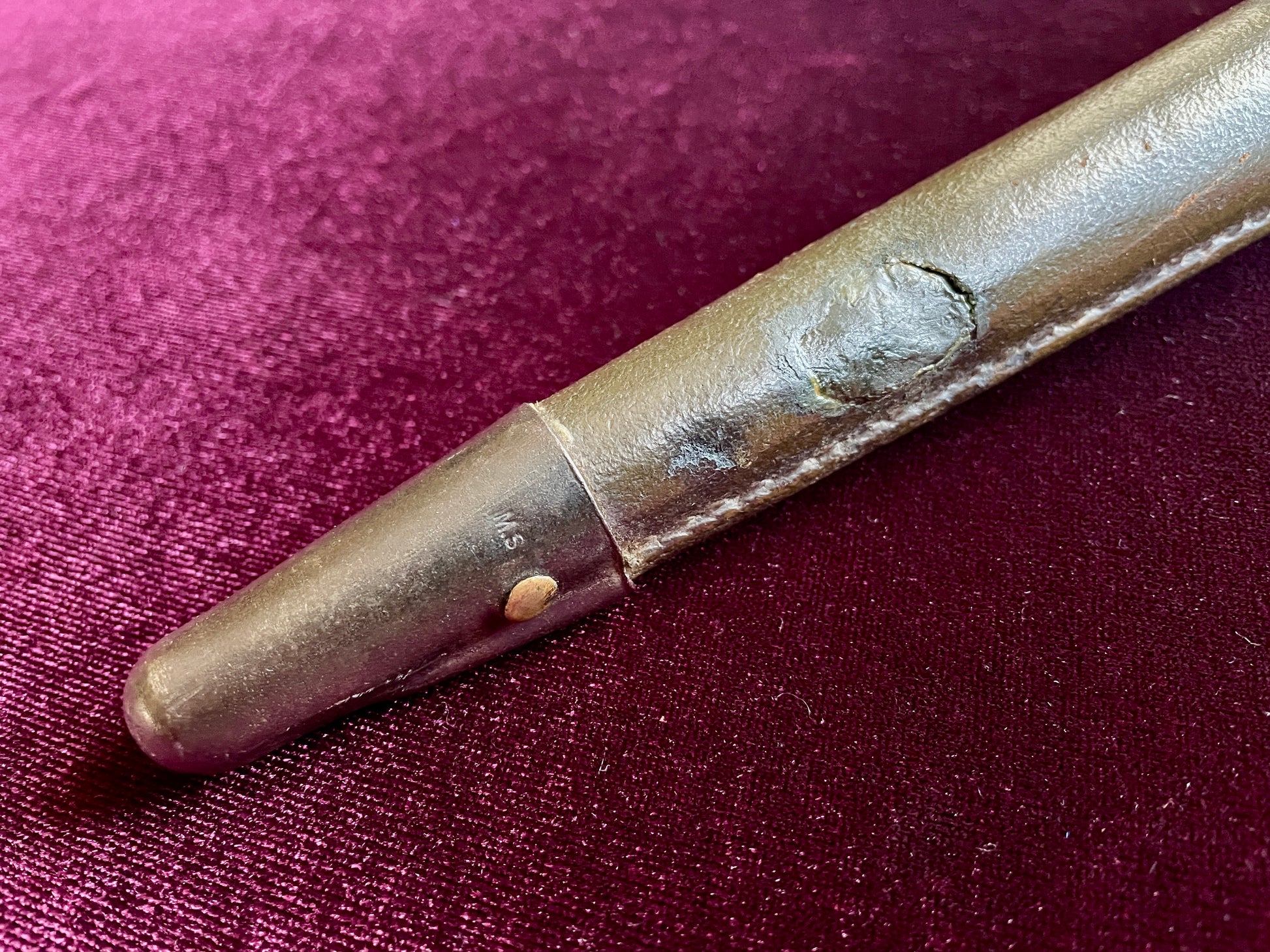 Scabbard made by Jewell Belt Co. ("JEWELL-1918") is green leather with some damage and one missing pin on the end cap. Overall good condition.