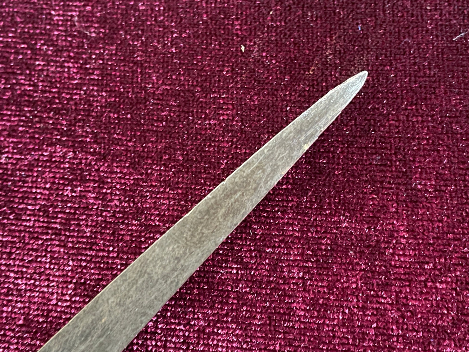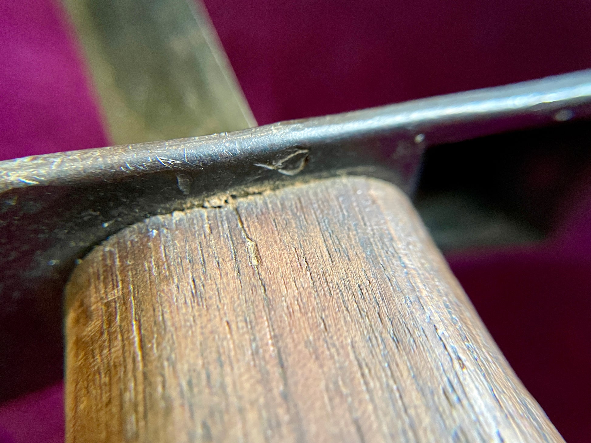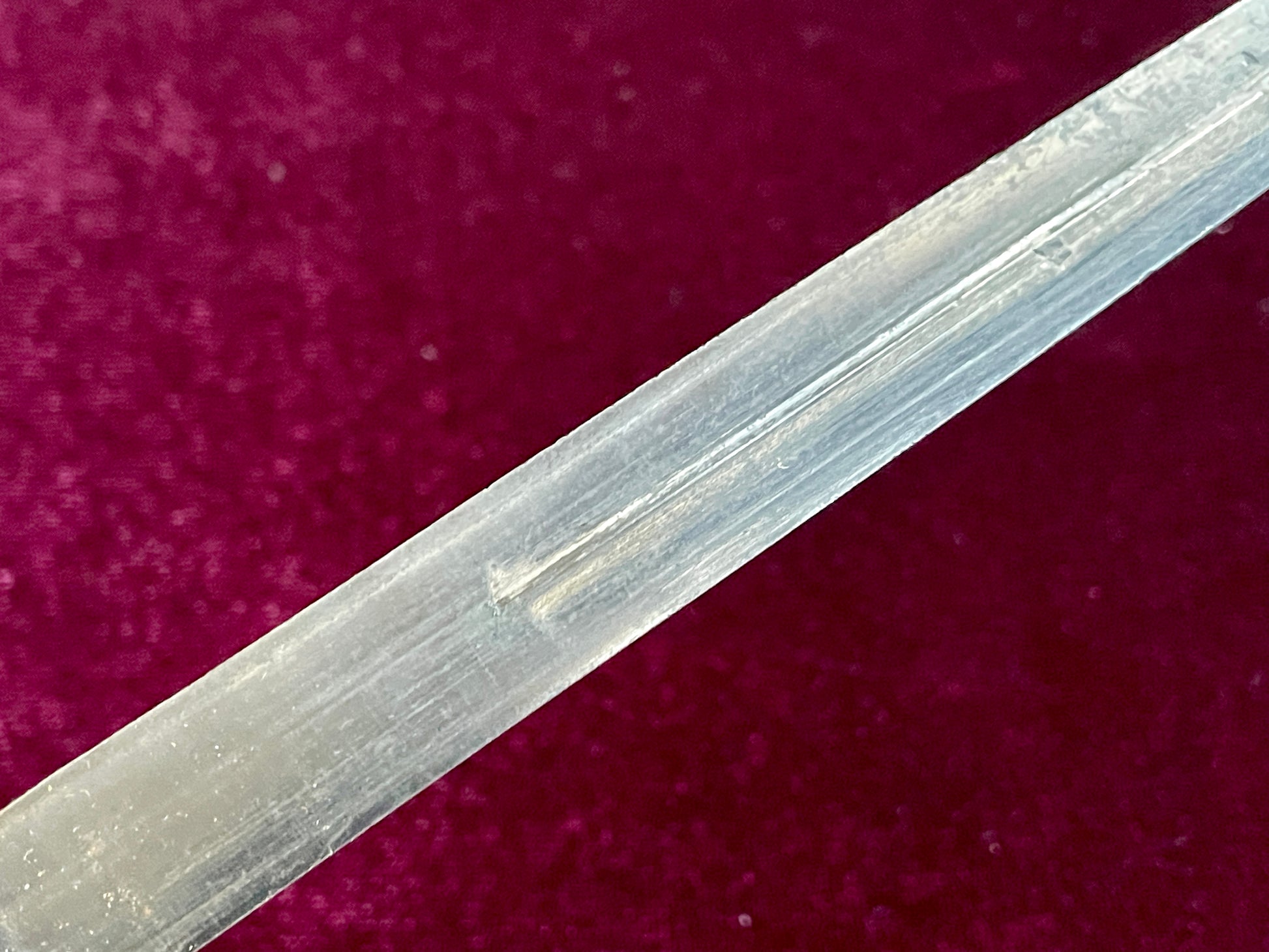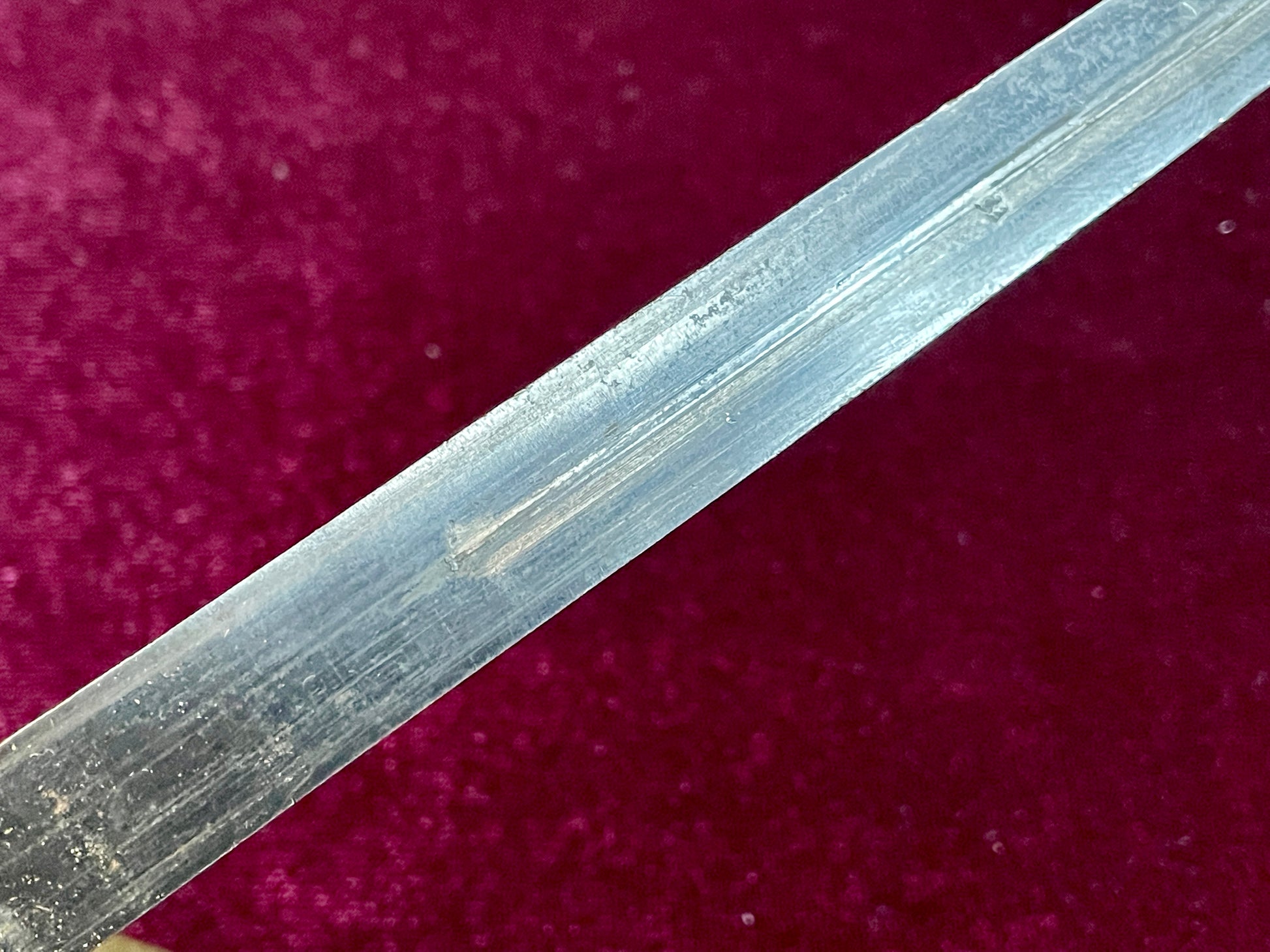 Scabbard made by Jewell Belt Co. ("JEWELL-1918") is green leather with some damage and one missing pin on the end cap. Overall good condition.