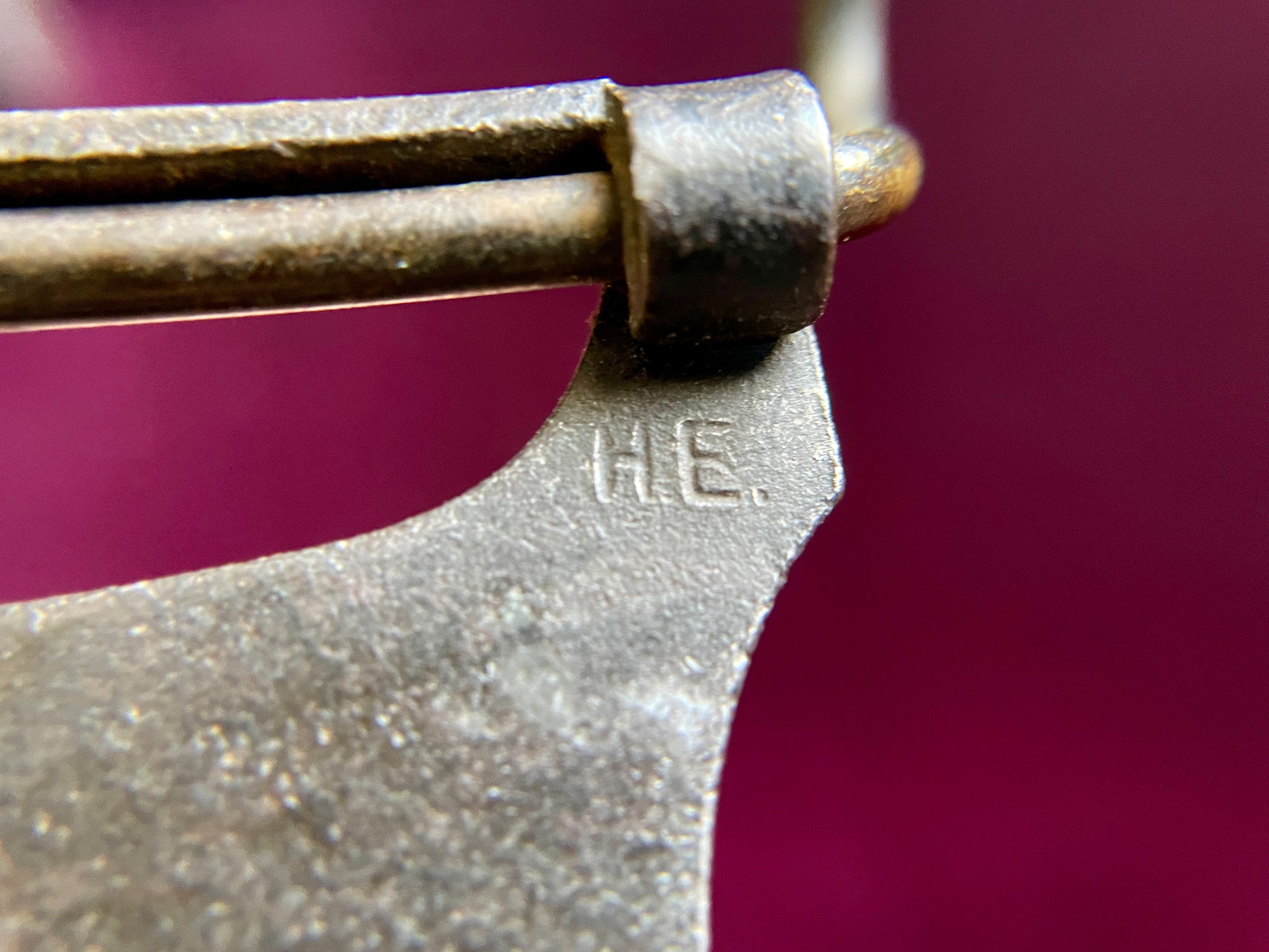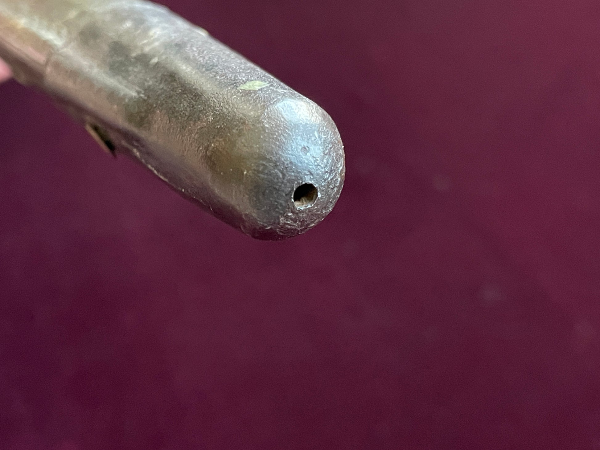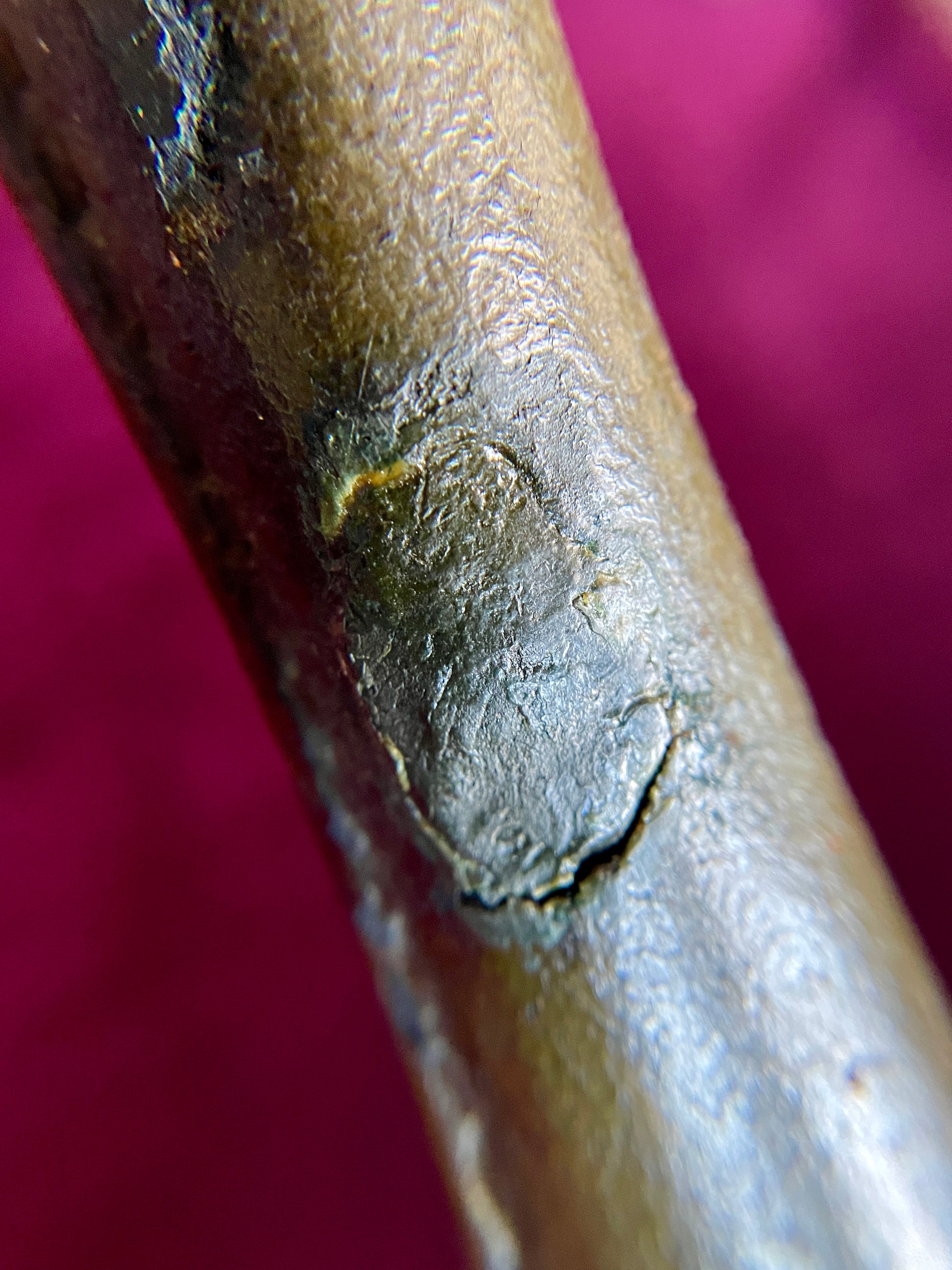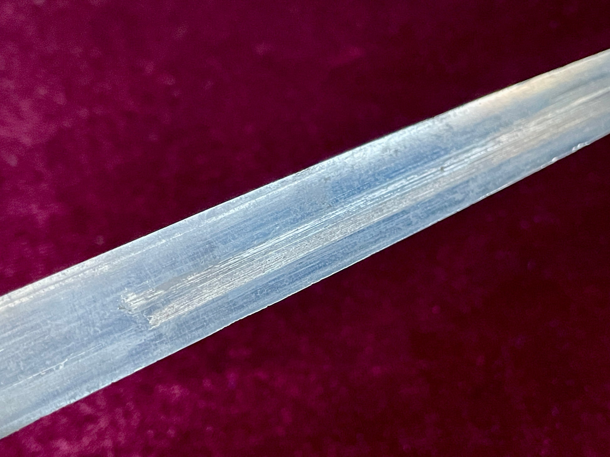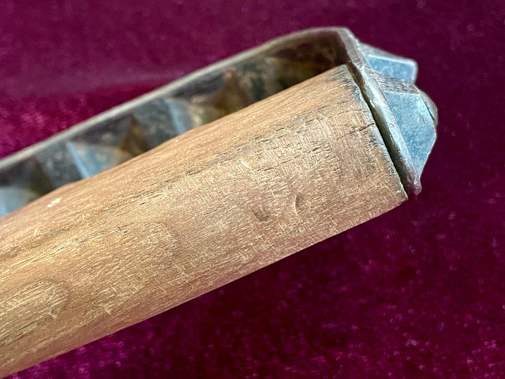 Scabbard made by Jewell Belt Co. ("JEWELL-1918") is green leather with some damage and one missing pin on the end cap. Overall good condition.